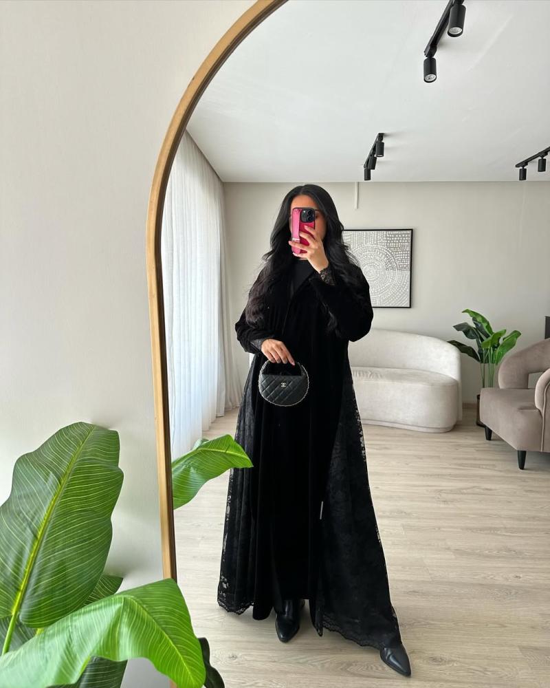 التفاصيــل: عبايه مخمل كوري مع تدخلية دانتيل فرنسي - قصة كلوش - طرحه ساده