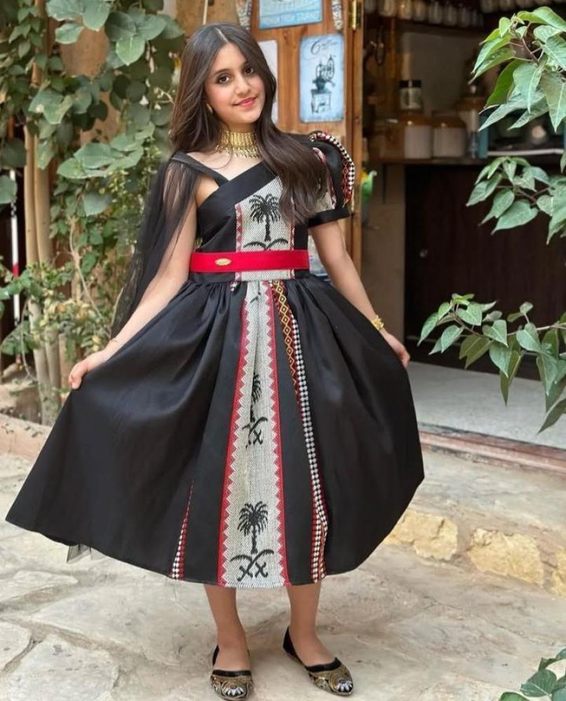فستان بناتي بنقشة السدو التراثية وتصميم عصري انيق