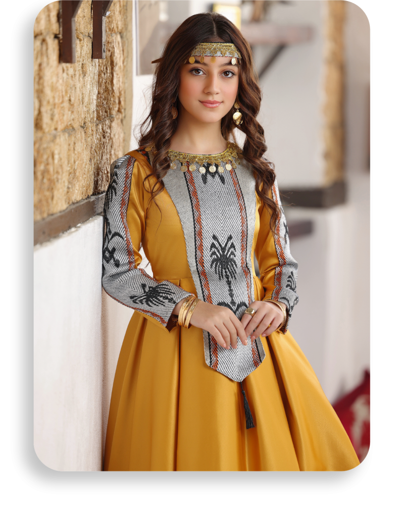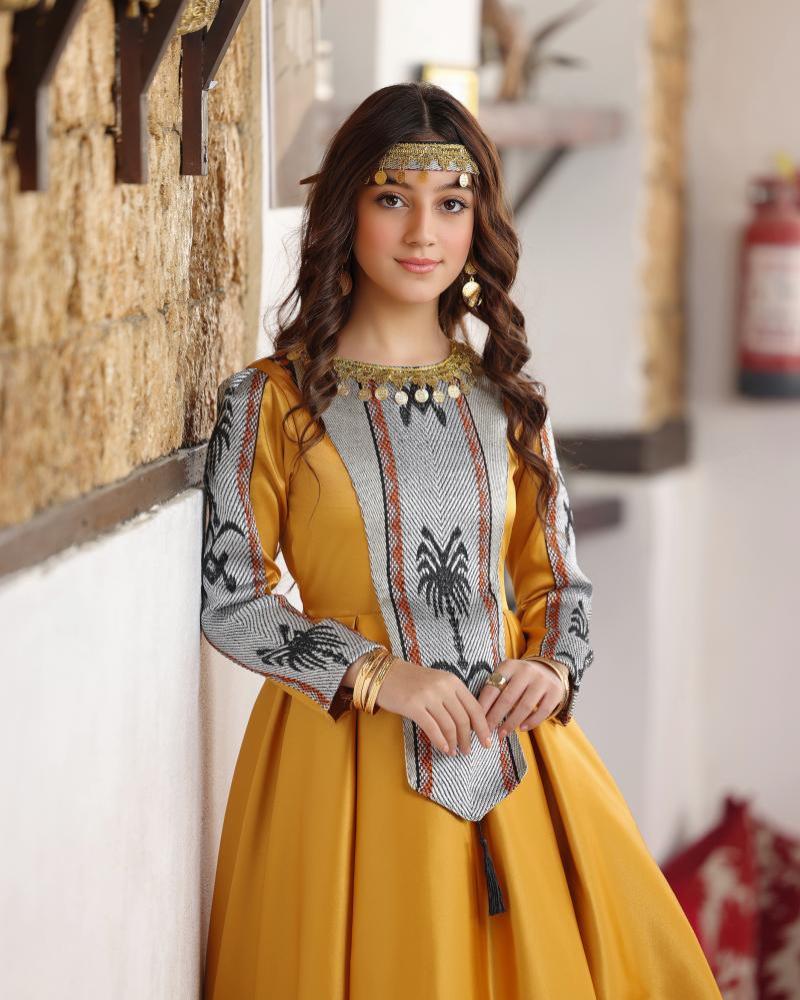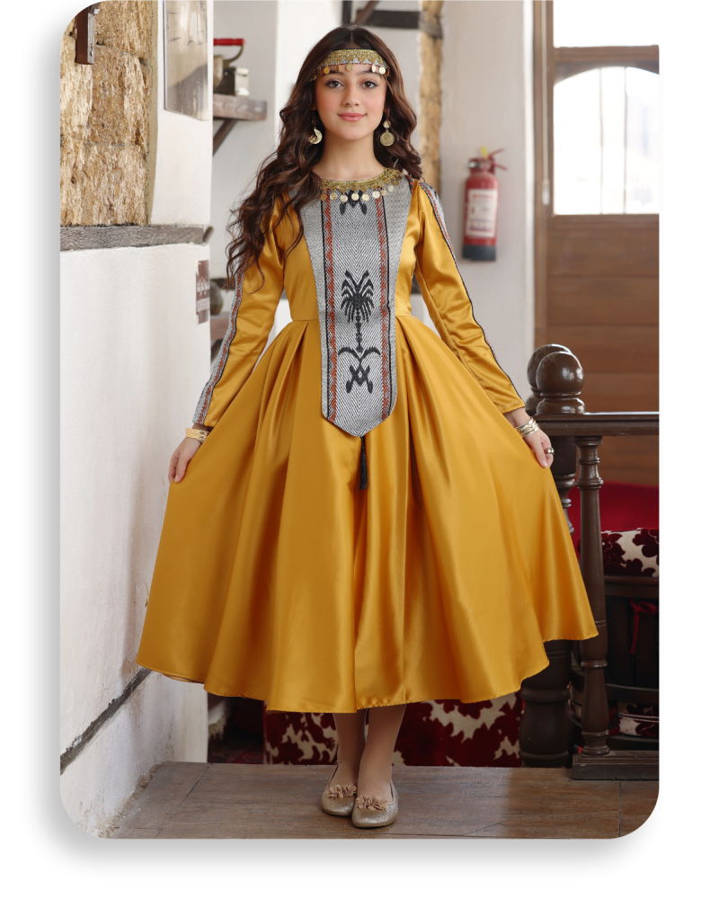 ومع وجود ربطة على الرأس واكسسوار هلل ذهبي على الرقبة يصبح هذا الفستان مثاليًا للمناسبات الخاصة، حيث ستشعر طفلتك وكأنها أميرة في كل لحظة.