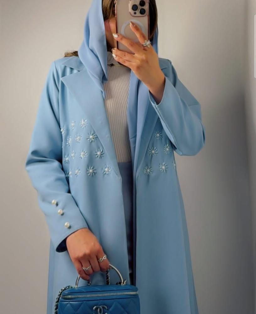 عباية باللون السماوي بقماش الكريب مع الشك اليدوي ممكن تغير الالوان حسب توافر القماش