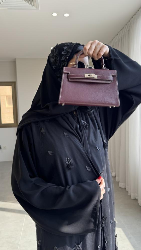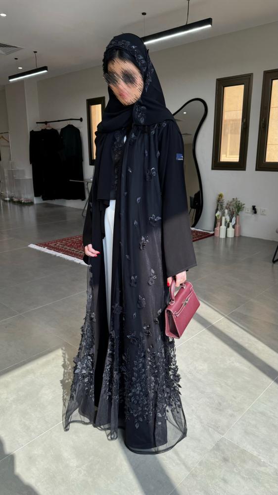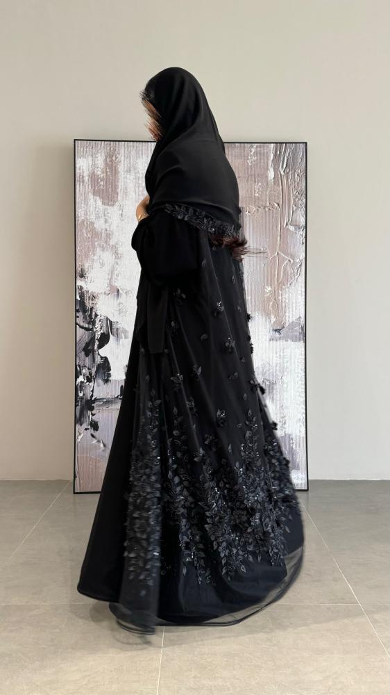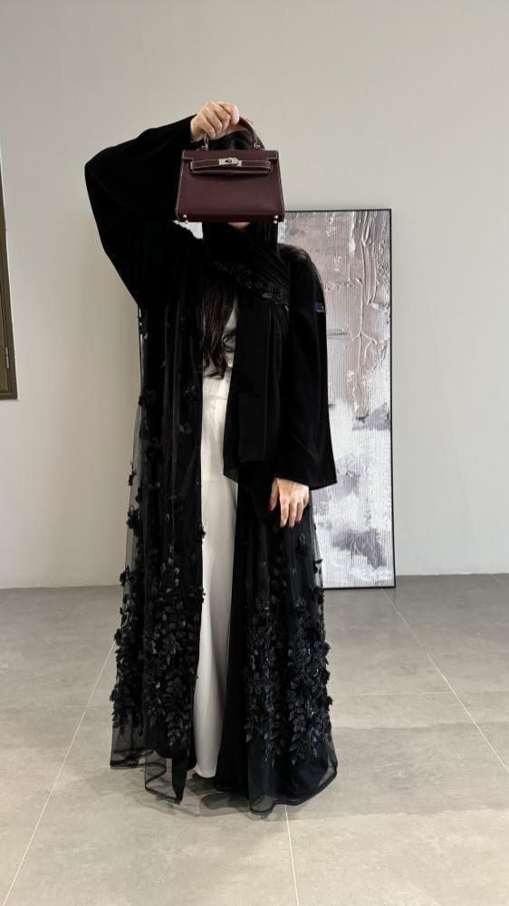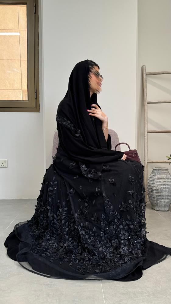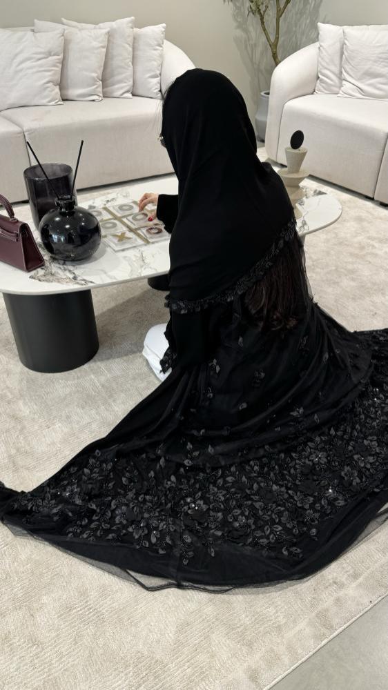 عباية سوداء بقماش الكريب الملكي مع قماش تل على كامل العباية بقصة النص كلوش