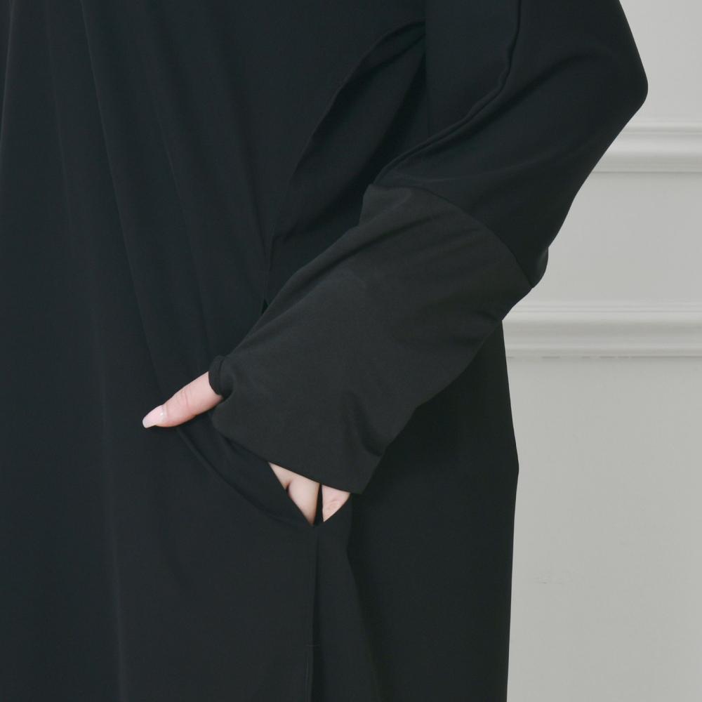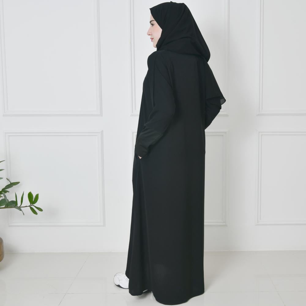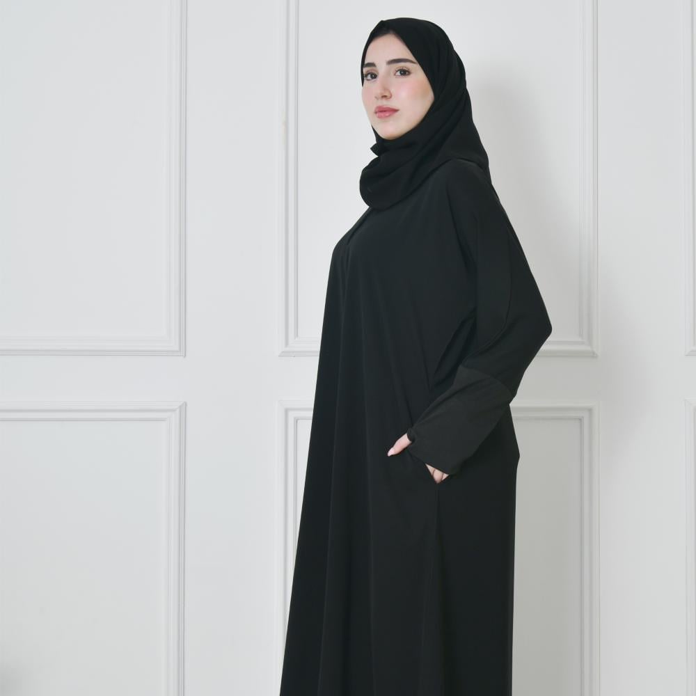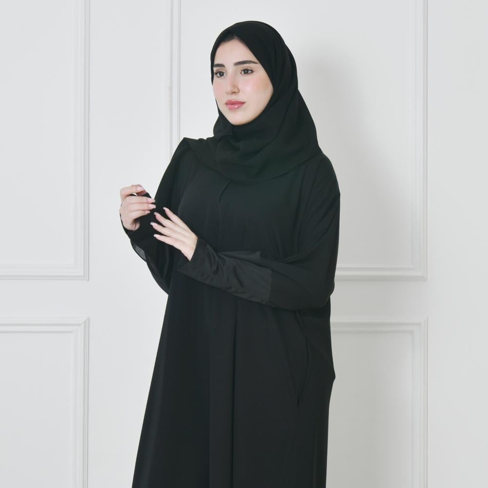 عباية سوداء مغلقة ربع كلوش مميزة مع طرحة مثبتة وأكمام بفتحة اصبع