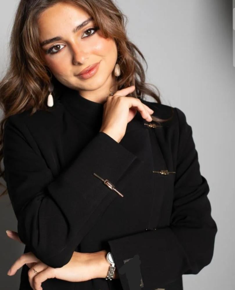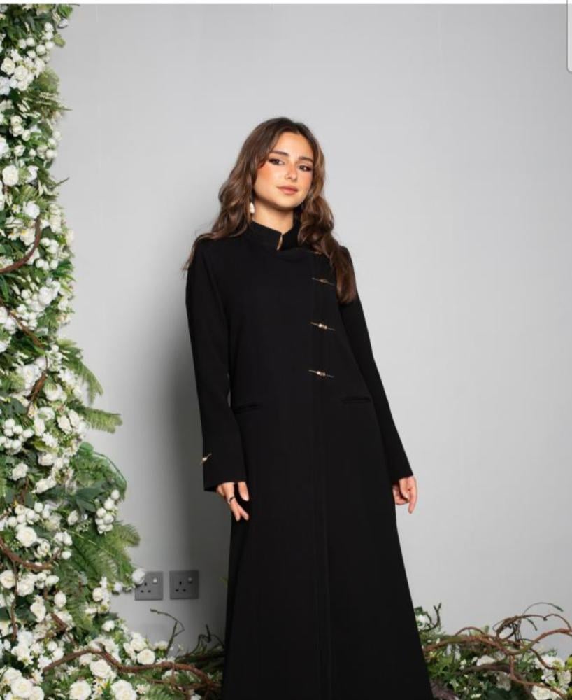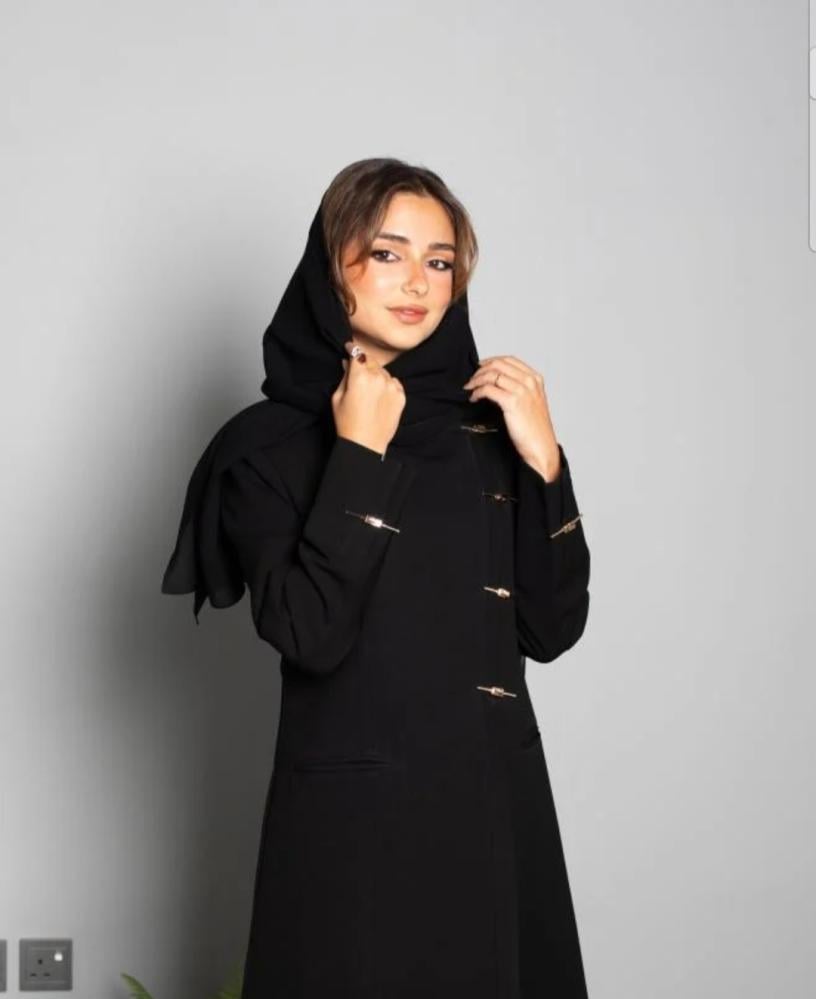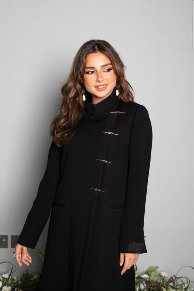 عباية بليزر راقية ومميزة باللون الأسود وبقماش كريب إيطالي مناسب لفصل الصيف . مزينة أسود مع جزء معدني ذهبي لإغلاق العباية . أنيقة ومميزة مناسبة لأوقات الدوام والعمل والمناسبات الرسمية .